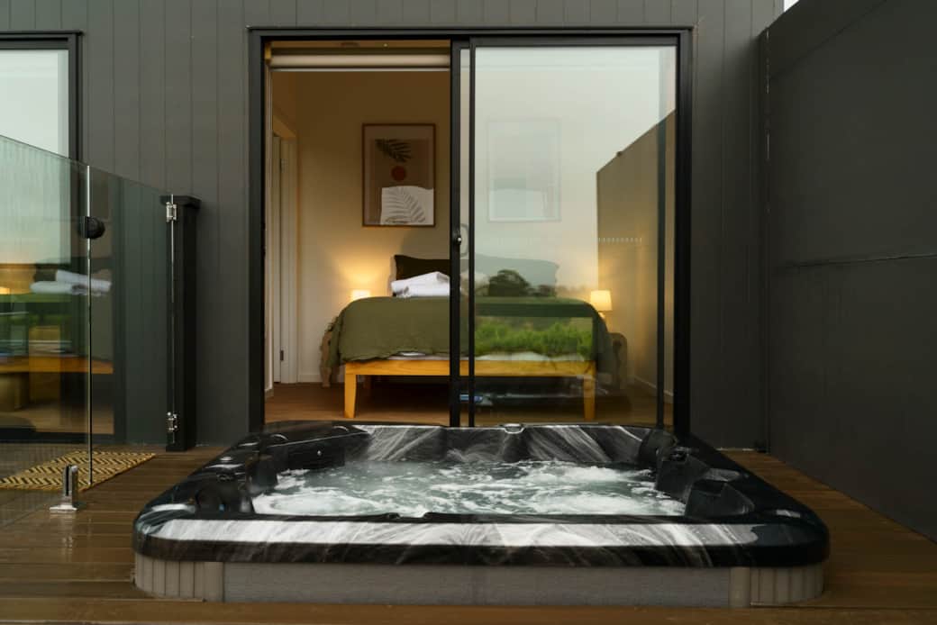 Outdoor spa, and a deep soaking bath — relaxed, not stuffy.